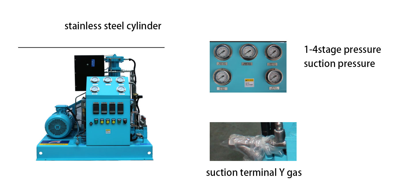 Four-stage compression, each stage is equipped with a safety valve, the inlet is equipped with low intake pressure protection, the exhaust end is equipped with high exhaust pressure protection, and each stage has a temperature sensor. If over-temperature and over-pressure, The system will alarm and stop, ensure safe operation, small size, light weight, and forklift parking position at the bottom, which can be easily moved.